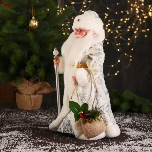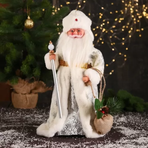 Дед Мороз под ёлку «Зимнее волшебство. В белой шубке, с посохом и мешком» двигается, 40 см
