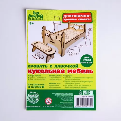 Деревянная мебель для кукол «Кровать с лавочкой»