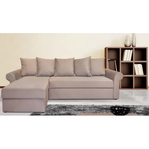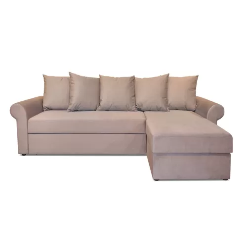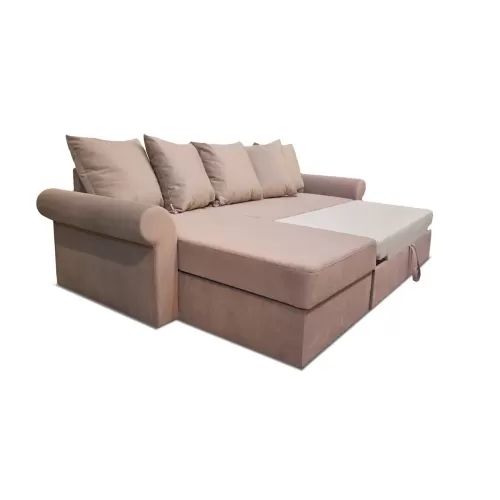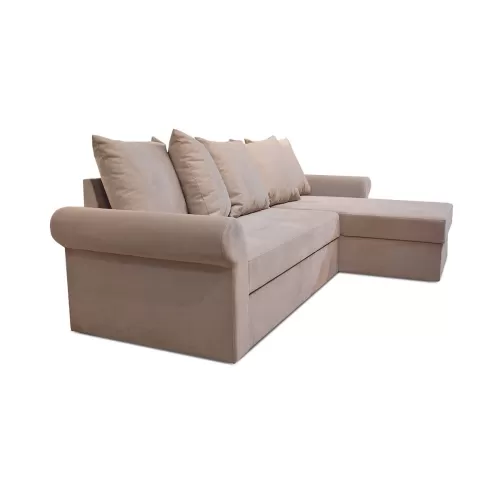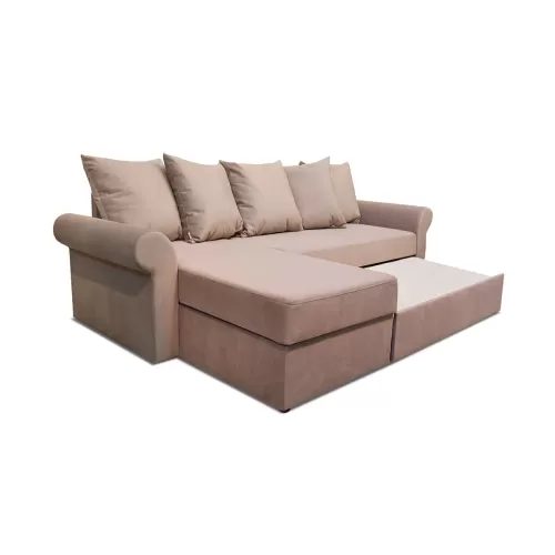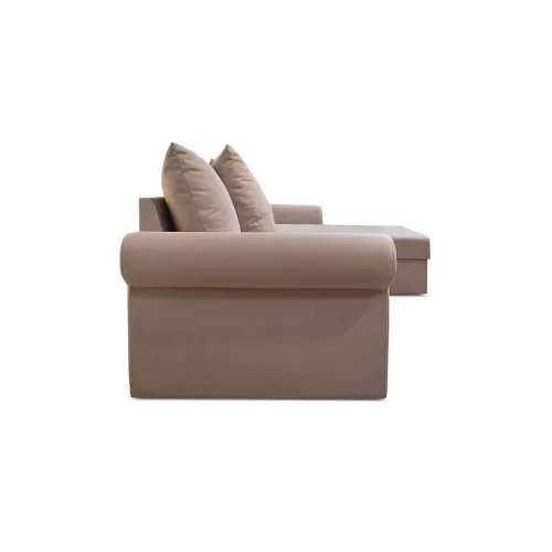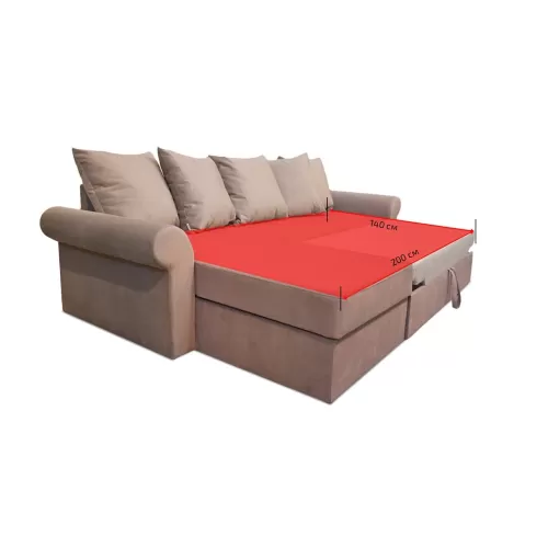 Бельевой короб, расположенный в оттоманке, позволяет бережно хранить спальные принадлежности или другие вещи. В зависимости от конструктивных особенностей пространства угол можно устанавливать как на левую, так и на правую сторону.