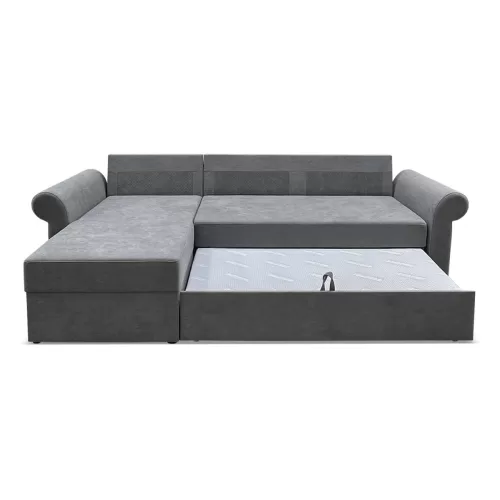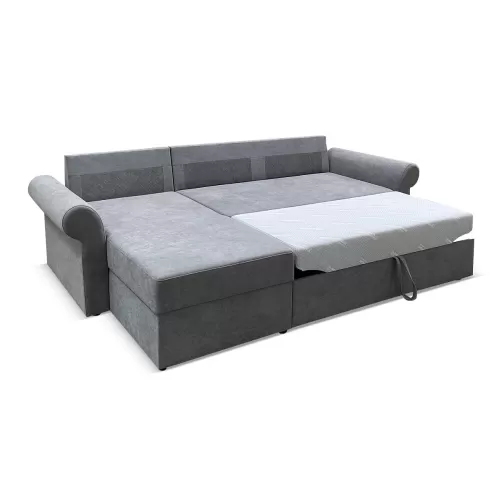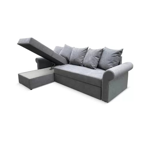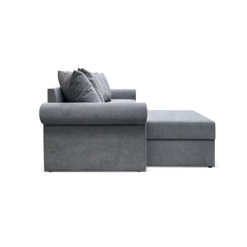 Бельевой короб, расположенный в оттоманке, позволяет бережно хранить спальные принадлежности или другие вещи. В зависимости от конструктивных особенностей пространства угол можно устанавливать как на левую, так и на правую сторону.