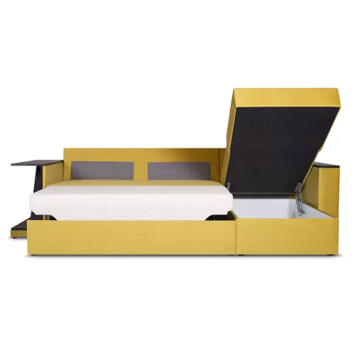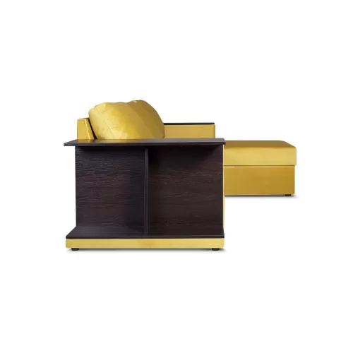 Деревянные вставки на подлокотниках заменят собой кофейный столик. На них можно поставить кружку, положить гаджеты, книги, крема. Сама вставка выполнена из ДСП, а её кромка из ПВХ , что препятствует расслоению и порче материала при его активном использовании и влажной уборке. Ниже расположена полка для книг, сувениров и других предметов.