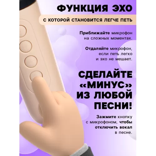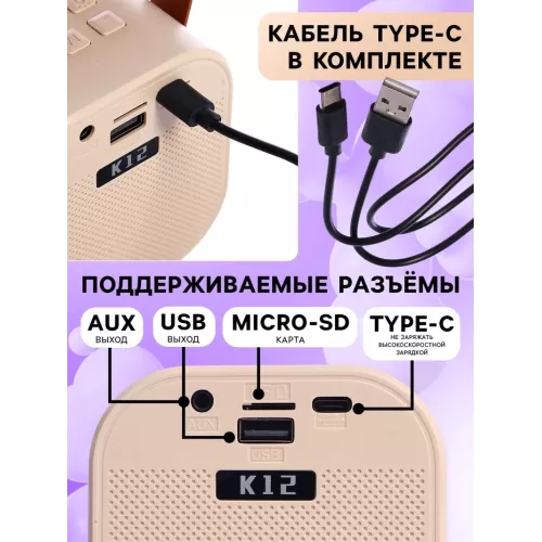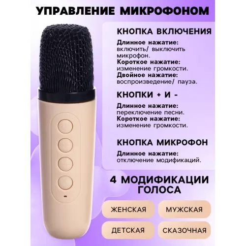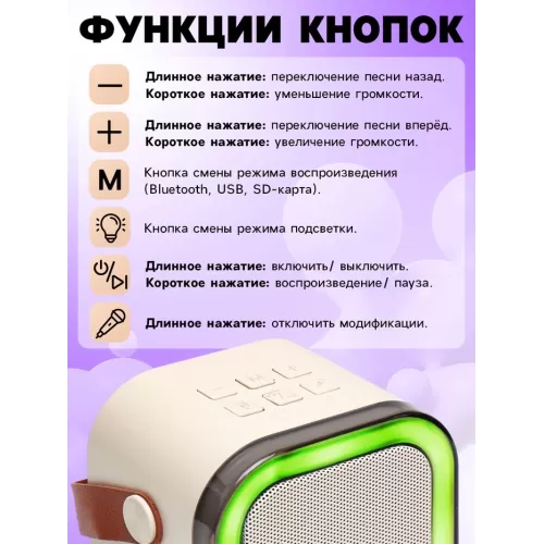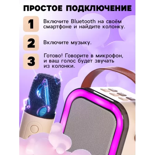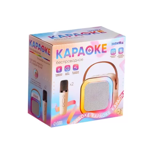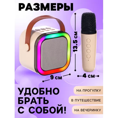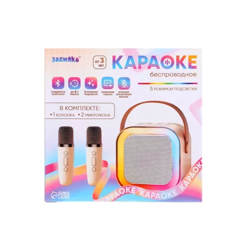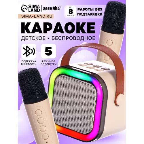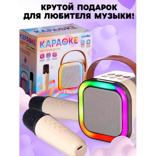 Караоке детское беспроводное, 2 микрофона, bluetooth, 5 режимов подсветки, звук, свет, бежевый