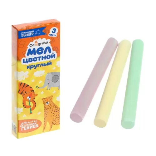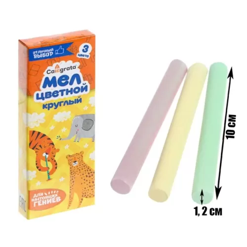Мел школьный цветной, набор 3 цвета, круглый, беспыльный в картонной коробке