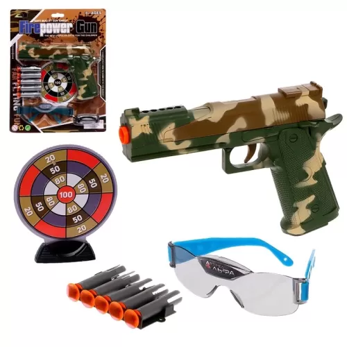 Пистолет «Глок», с мишенью и очками, стреляет присосками