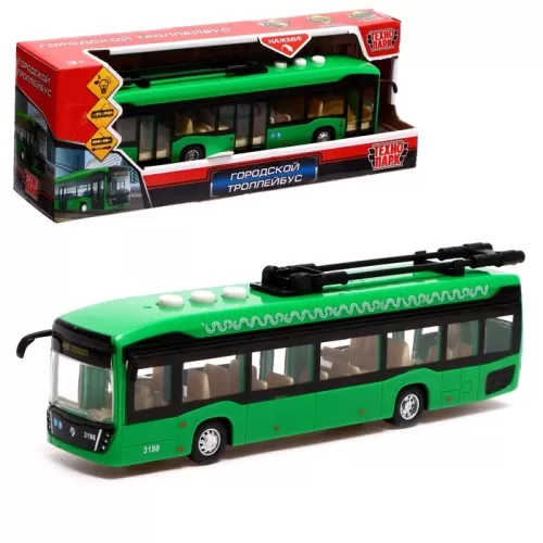 Троллейбус «Городской», 19 см, 3 кнопки, инерция, цвет зелёный, световые и звуковые эффекты
